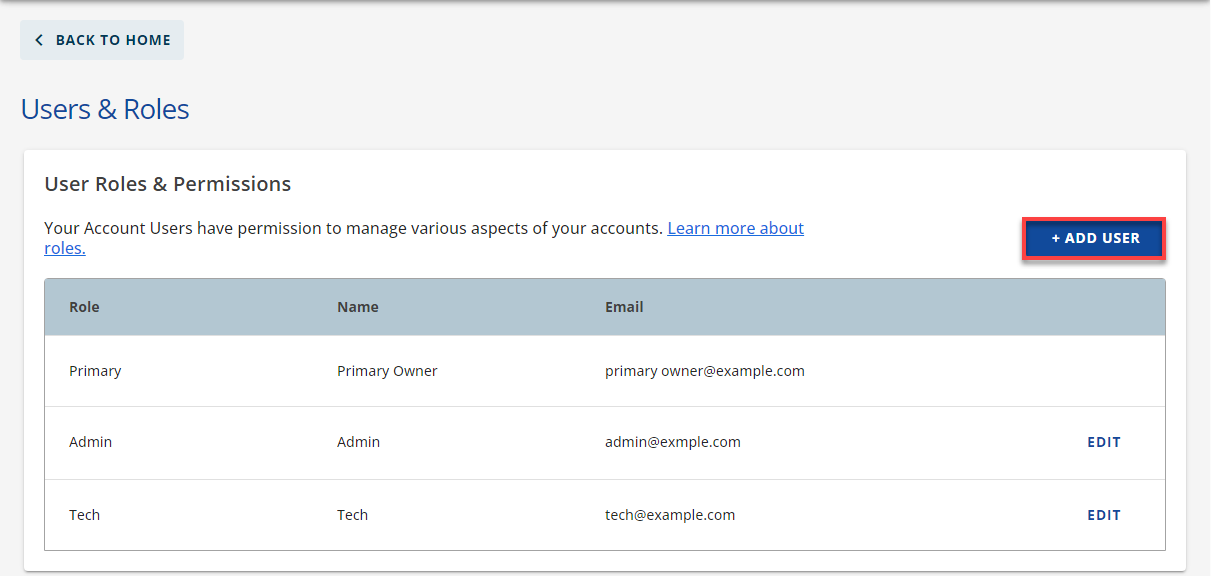 - Add a user: Scroll down to the "User Roles & Permissions" section and click "+ Add User".